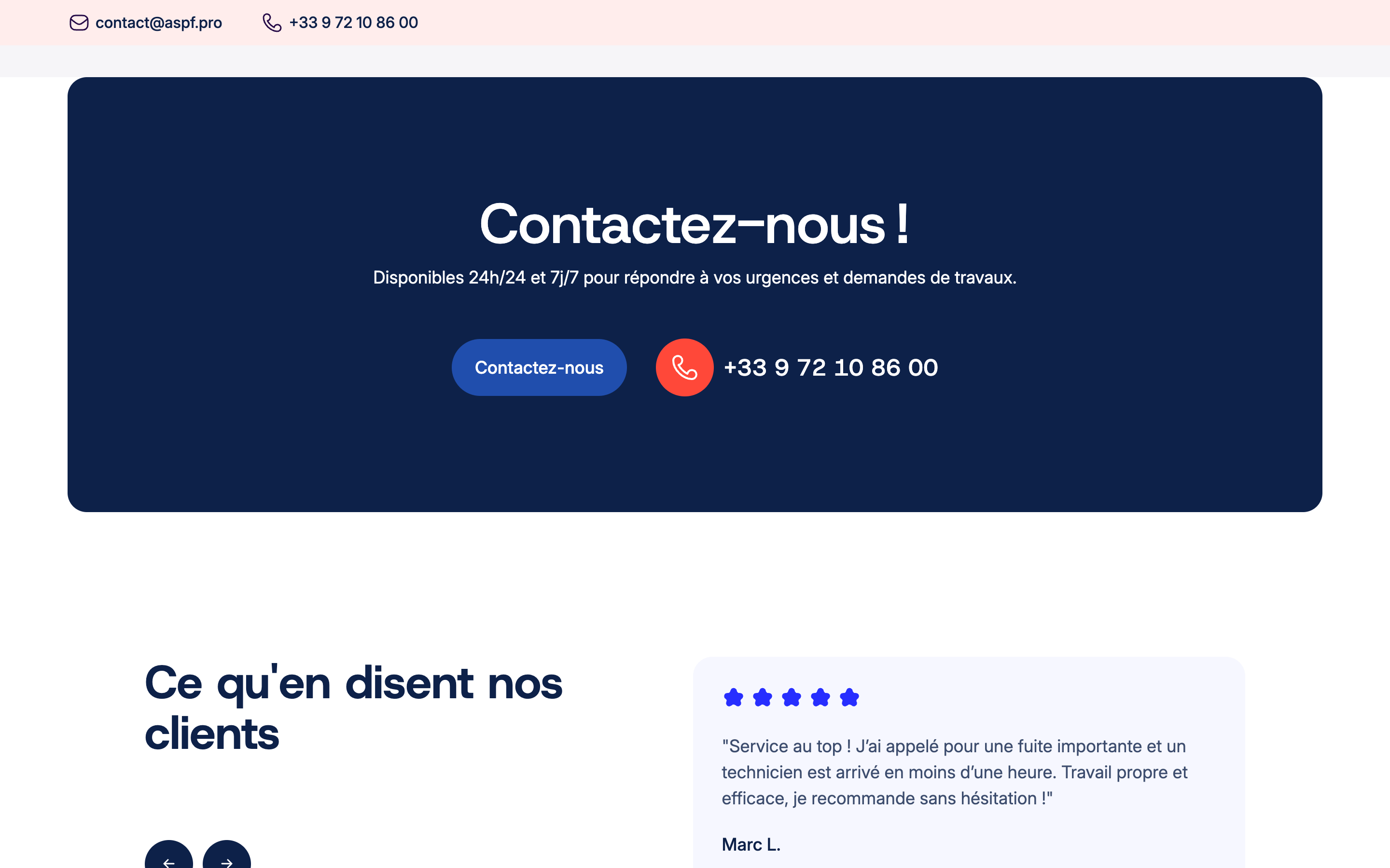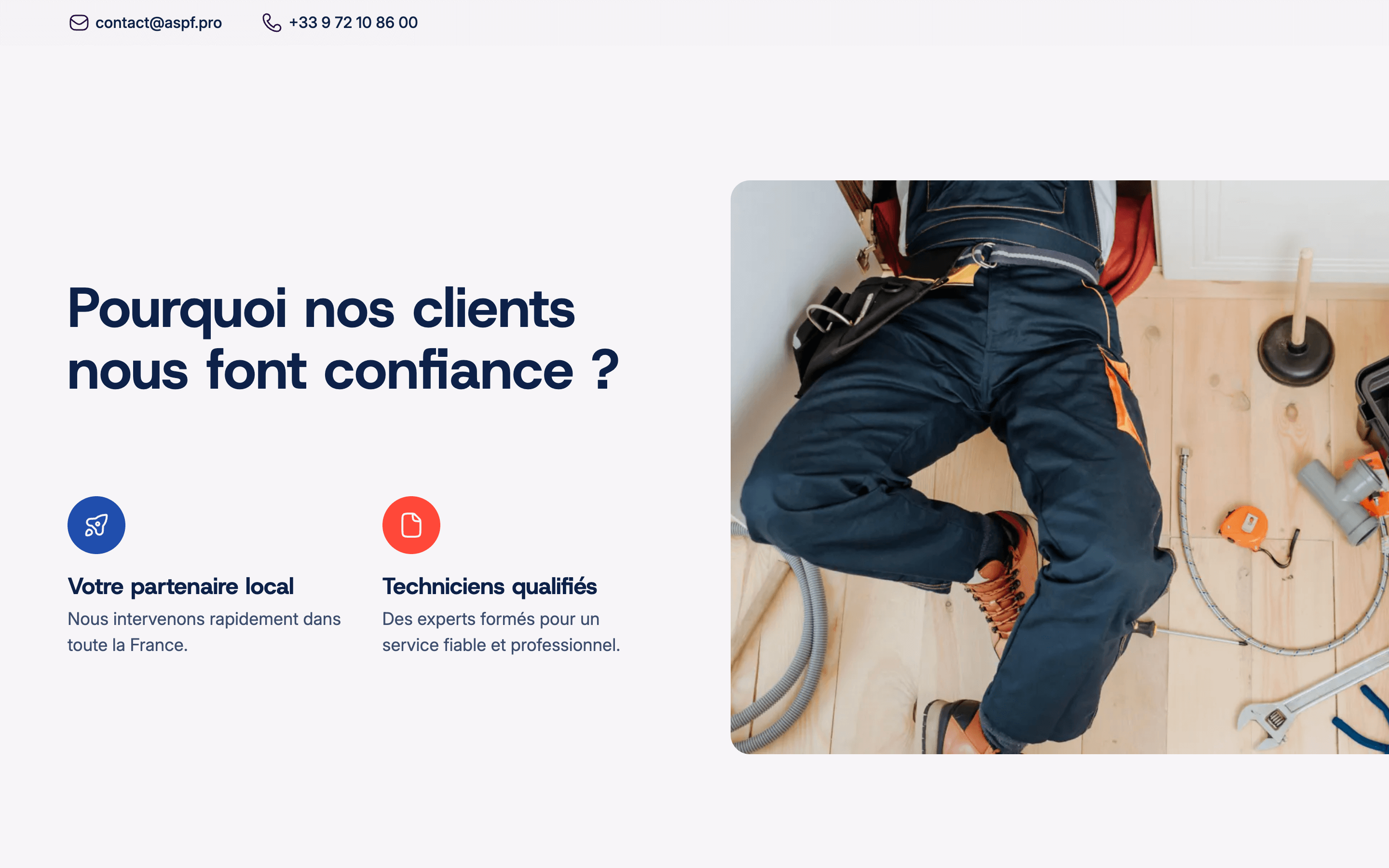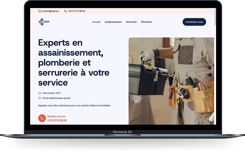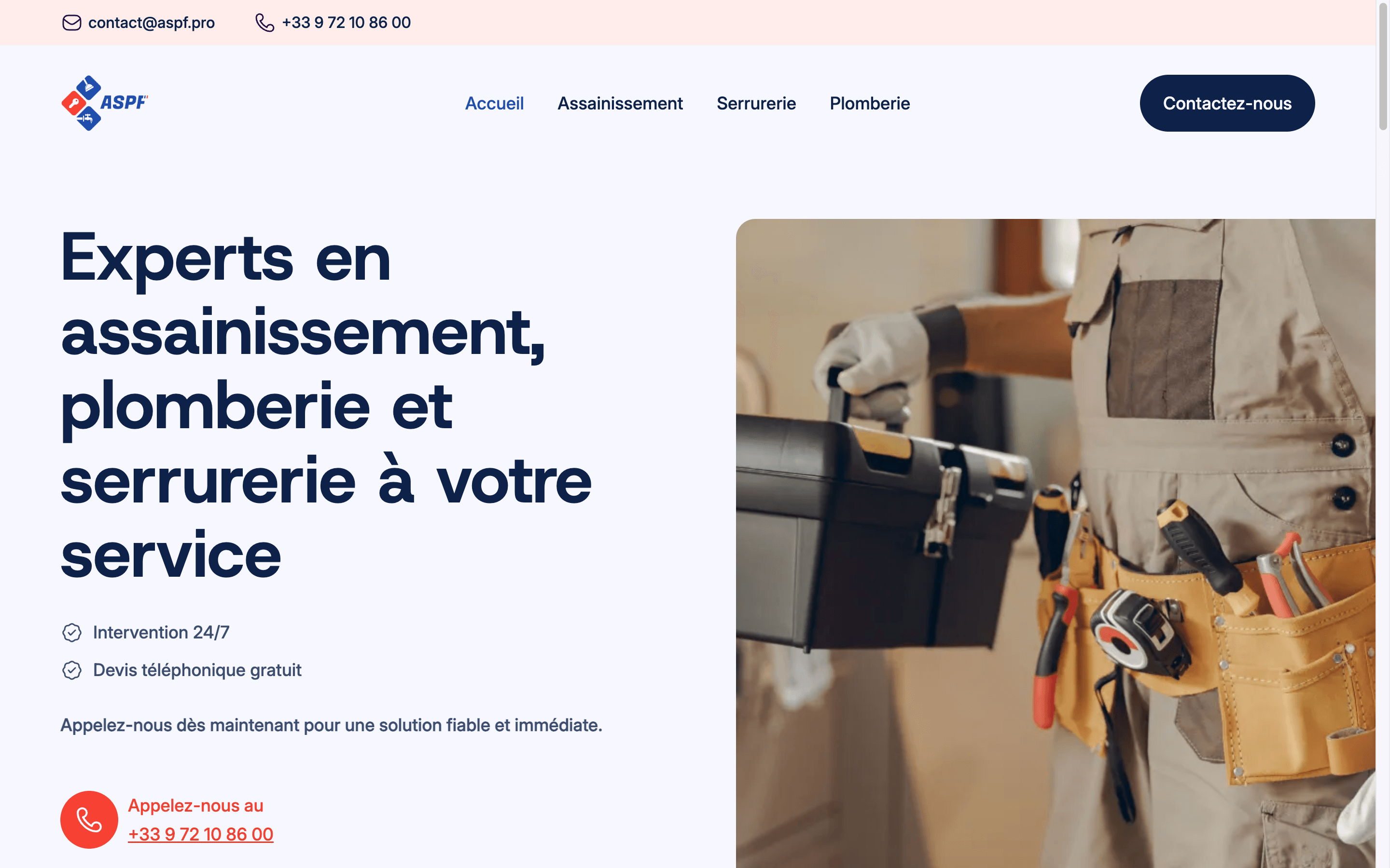 ASPF est un site vitrine d'une entreprise de services d'assainissement, plomberie et serrurerie que j'ai réalisé en tant que Freelance. Après avoir défini les besoins et la charte graphique avec le client, j'ai utilisé Webflow pour développer le site. J'ai également mis en place des mails automatiques avec Formsubmit pour les formulaires de contact et de devis.