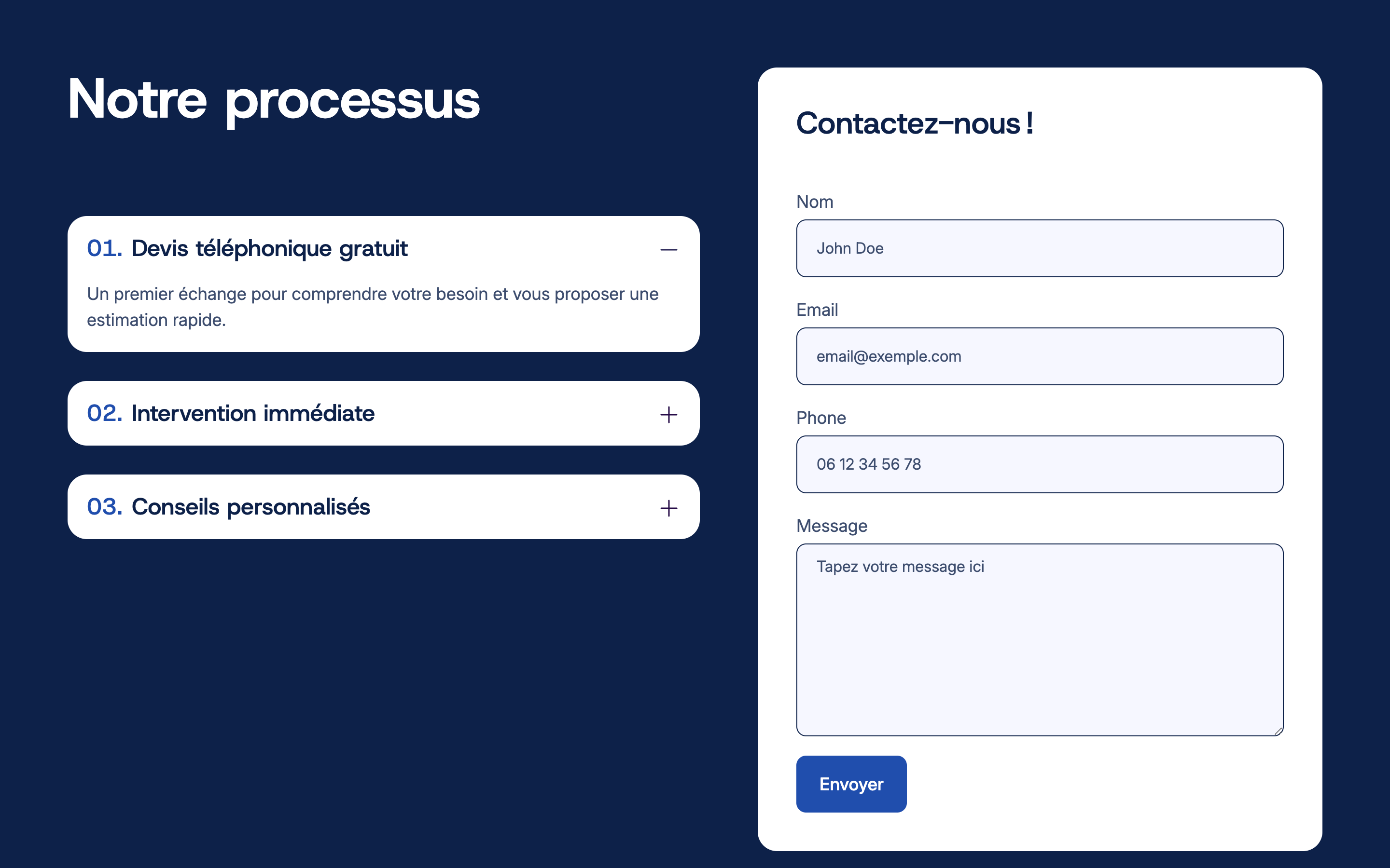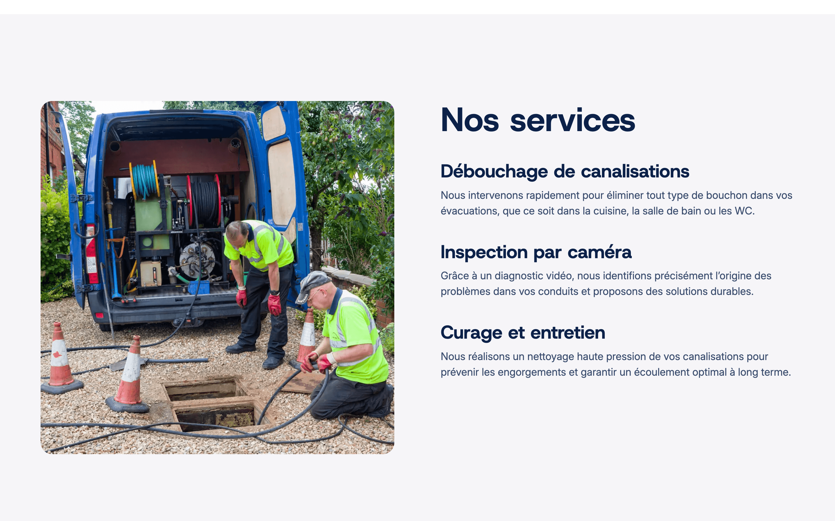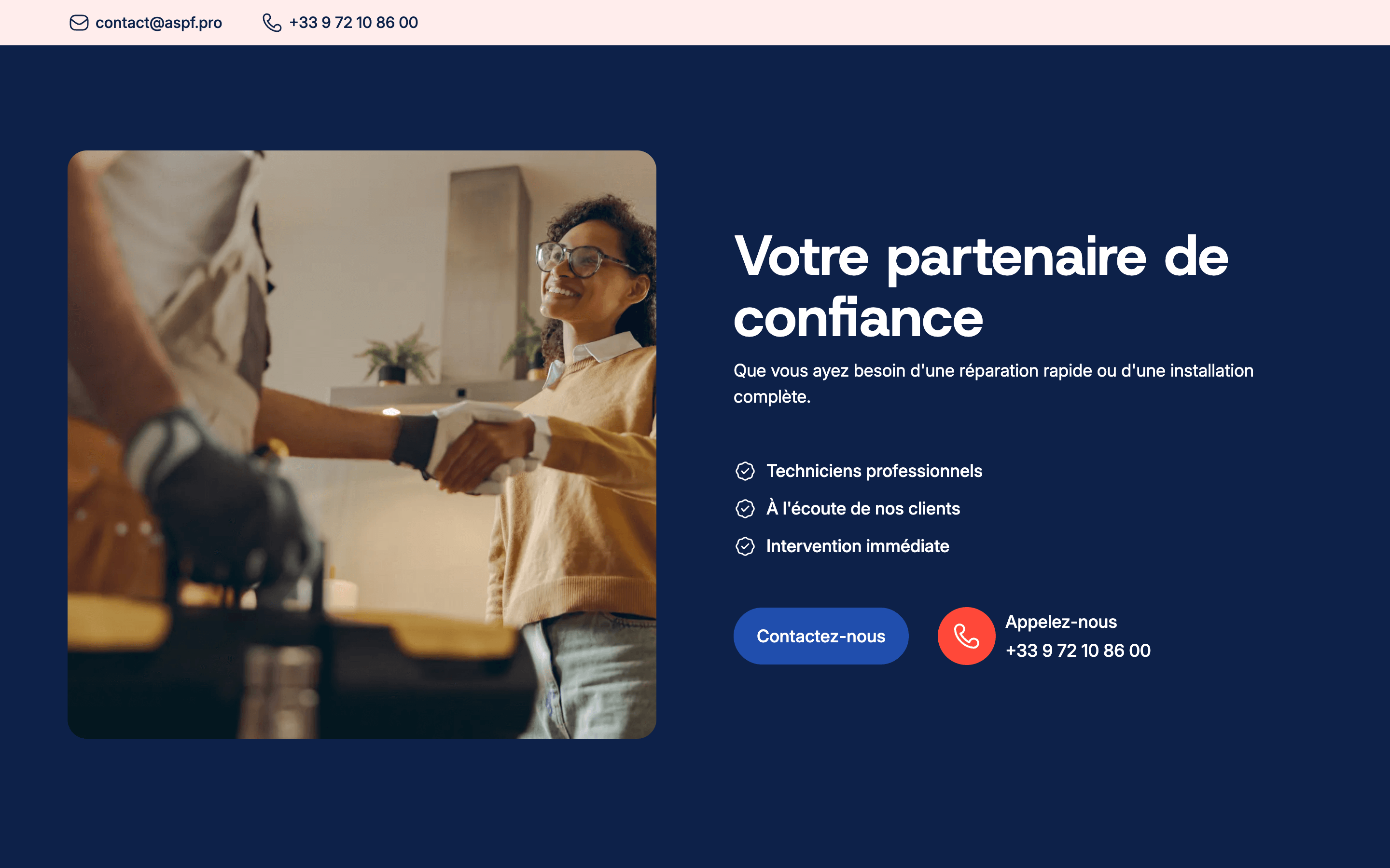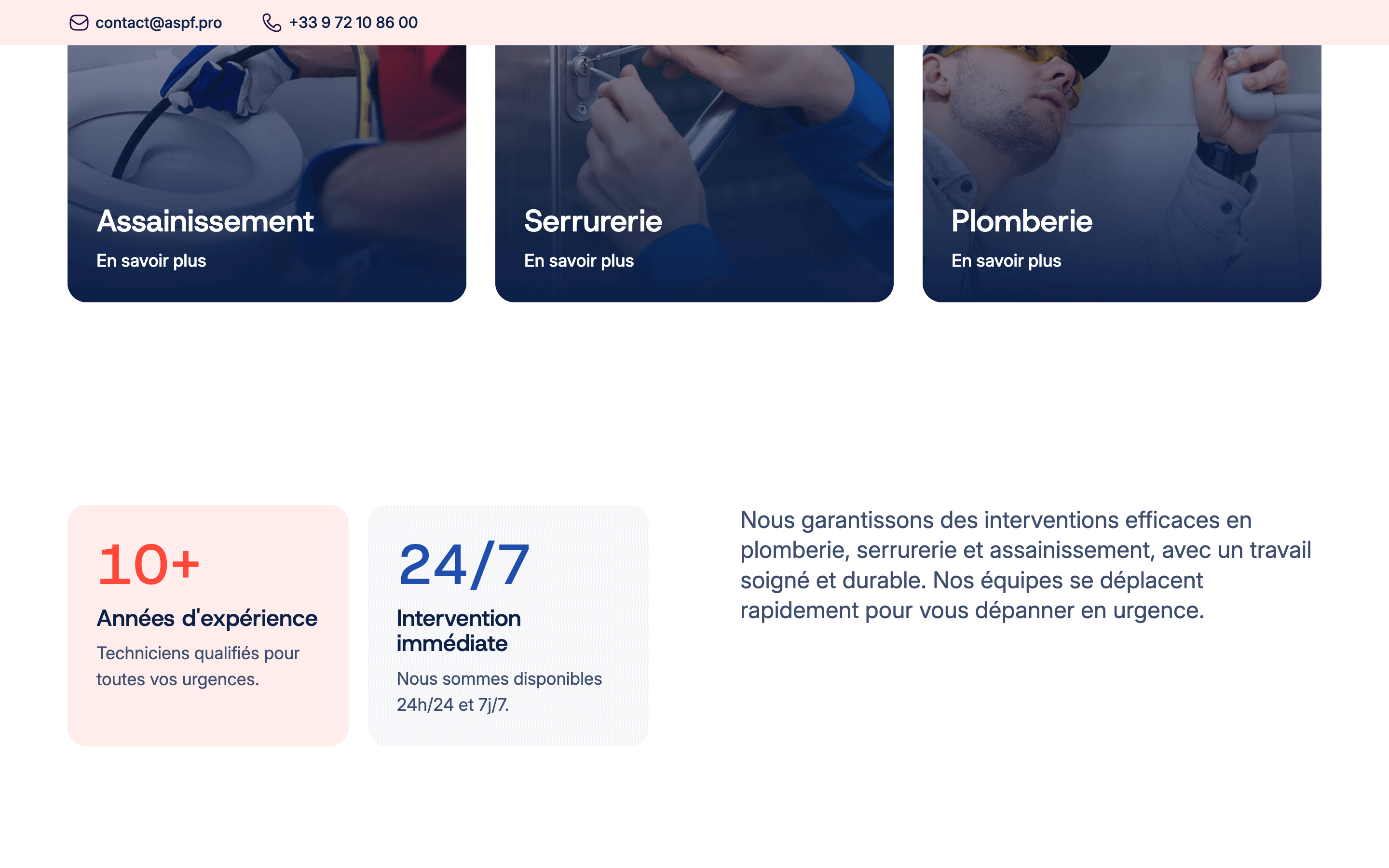 ASPF est un site vitrine d'une entreprise de services d'assainissement, plomberie et serrurerie que j'ai réalisé en tant que Freelance. Après avoir défini les besoins et la charte graphique avec le client, j'ai utilisé Webflow pour développer le site. J'ai également mis en place des mails automatiques avec Formsubmit pour les formulaires de contact et de devis.